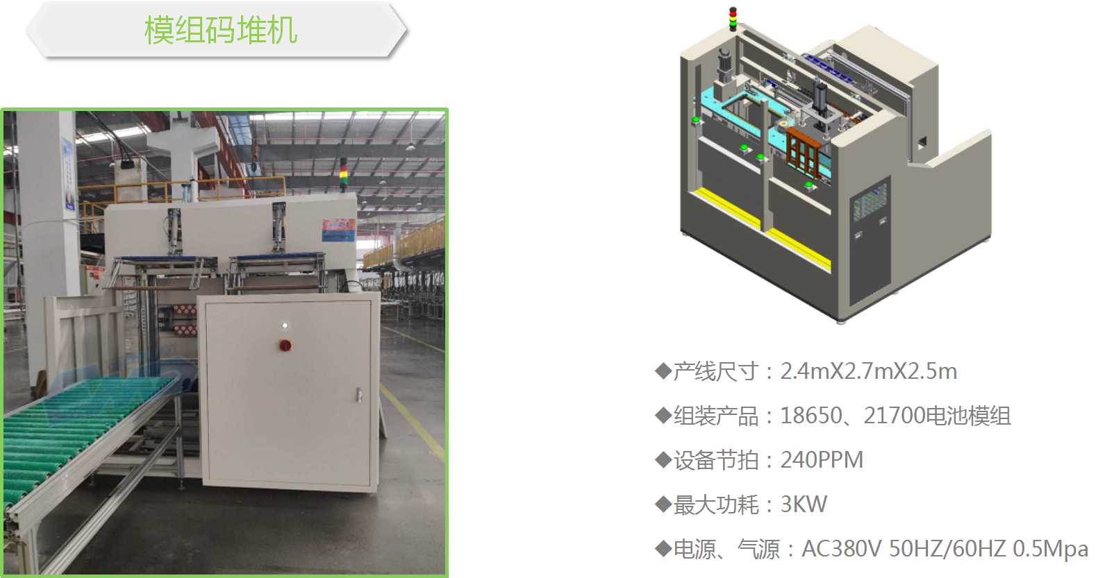 - 电芯模组码堆机是将不同的模块组合成一个完整模组的一体化双工位工作站。
