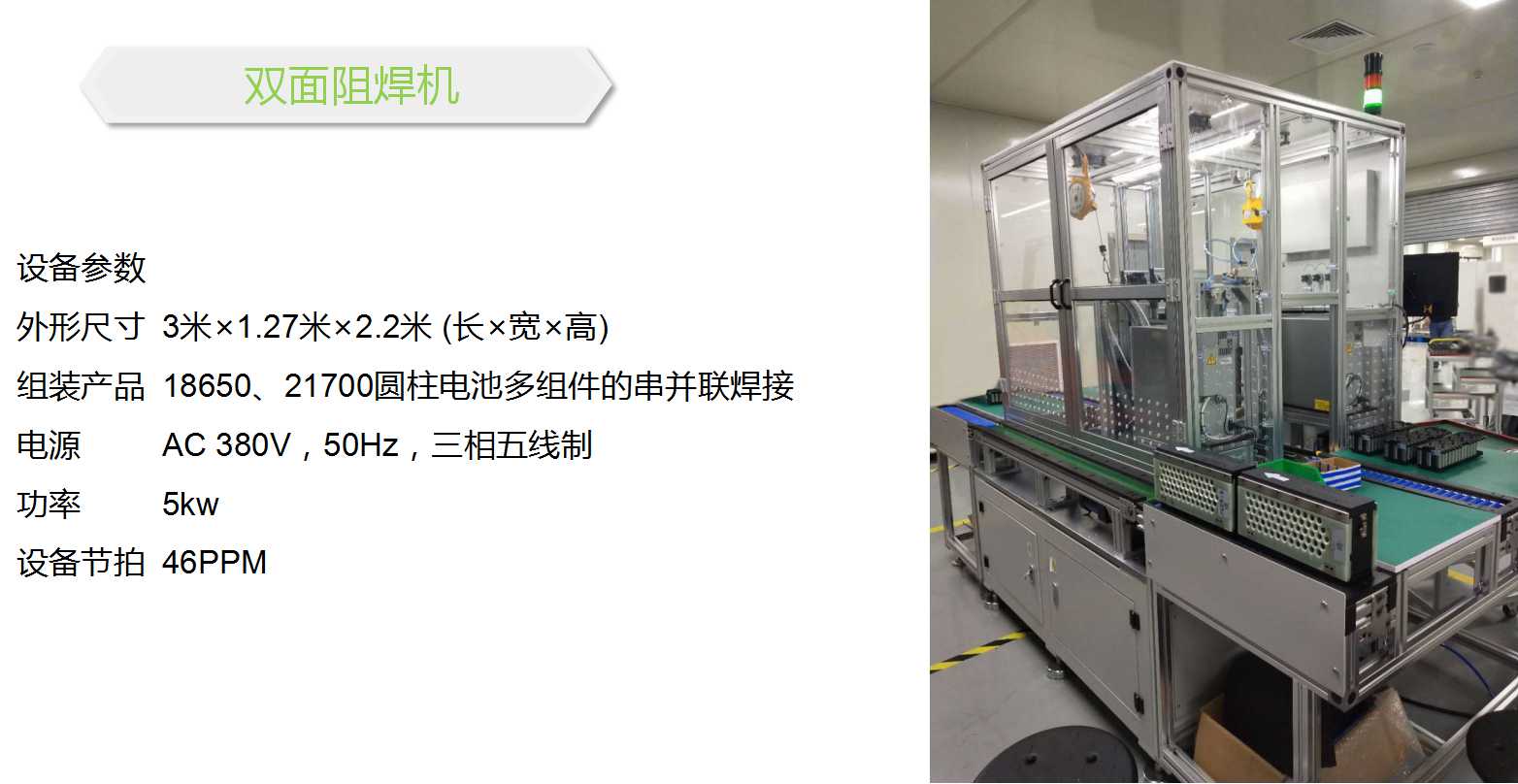 - 设备精度高、效率快、单个电芯平均焊接节拍小于1.3S,相对于传统的两点焊阻焊机生产效率提升了57%,且稳定性更好。