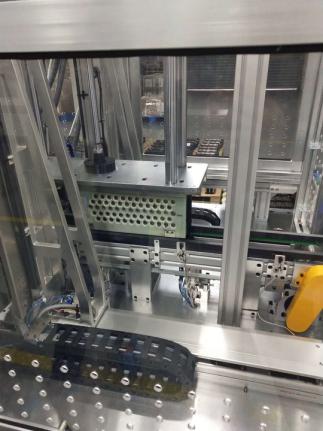 已装产品的焊接工装流入焊接皮带线内,光电检测工装到位,定位阻挡机构工作,气缸带动下压机构压紧焊接工装,压力可调,可以保证焊接时电芯焊接的稳定性。